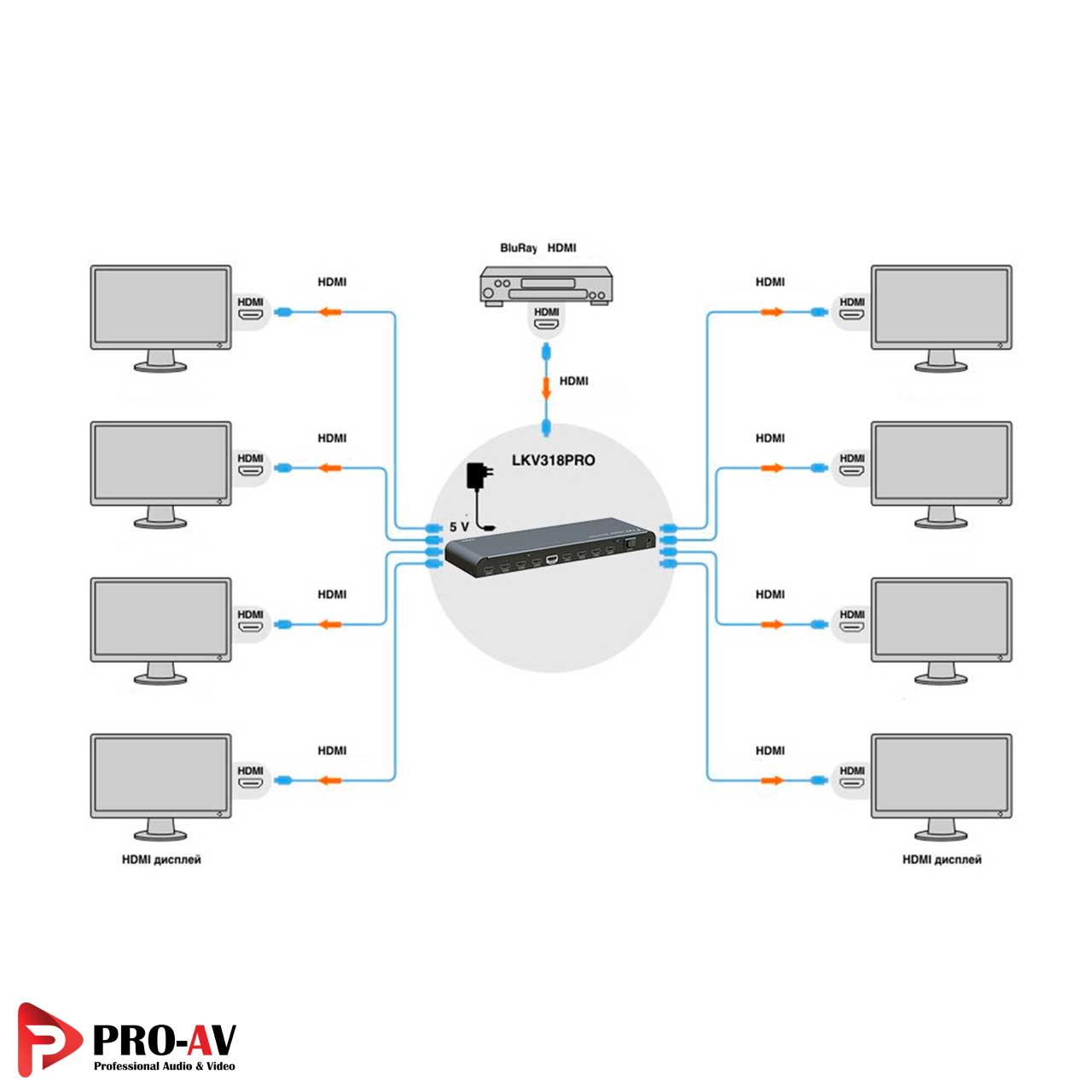 اسپلیتر HDMI مدل LKV318PRO، اسپلیتر ۱ به 8 سیگنال منبع تصویر مانند DVD Player یا PS3، Setup Box و … را به هشت سیگنال همزمان، همگام و مجزا جهت ارسال به دستگاهی مانند Projector، LCD یا دیگر نمایشگرهای تا وضوح 4Kx2Kتقسیم و منتقل میکند.