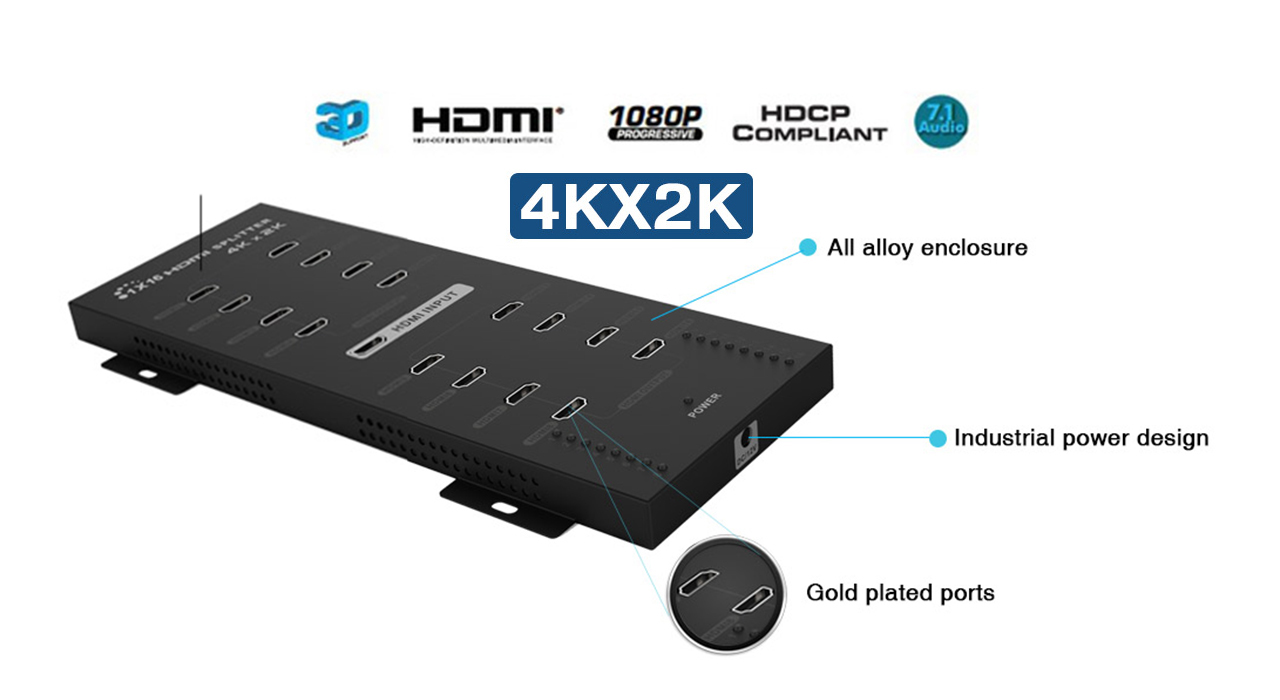 Projector، LCD یا دیگر نمایشگرهای 4K تقسیم میکند. این دستگاه دارای شانزده پورت خروجی از نوع HDMI