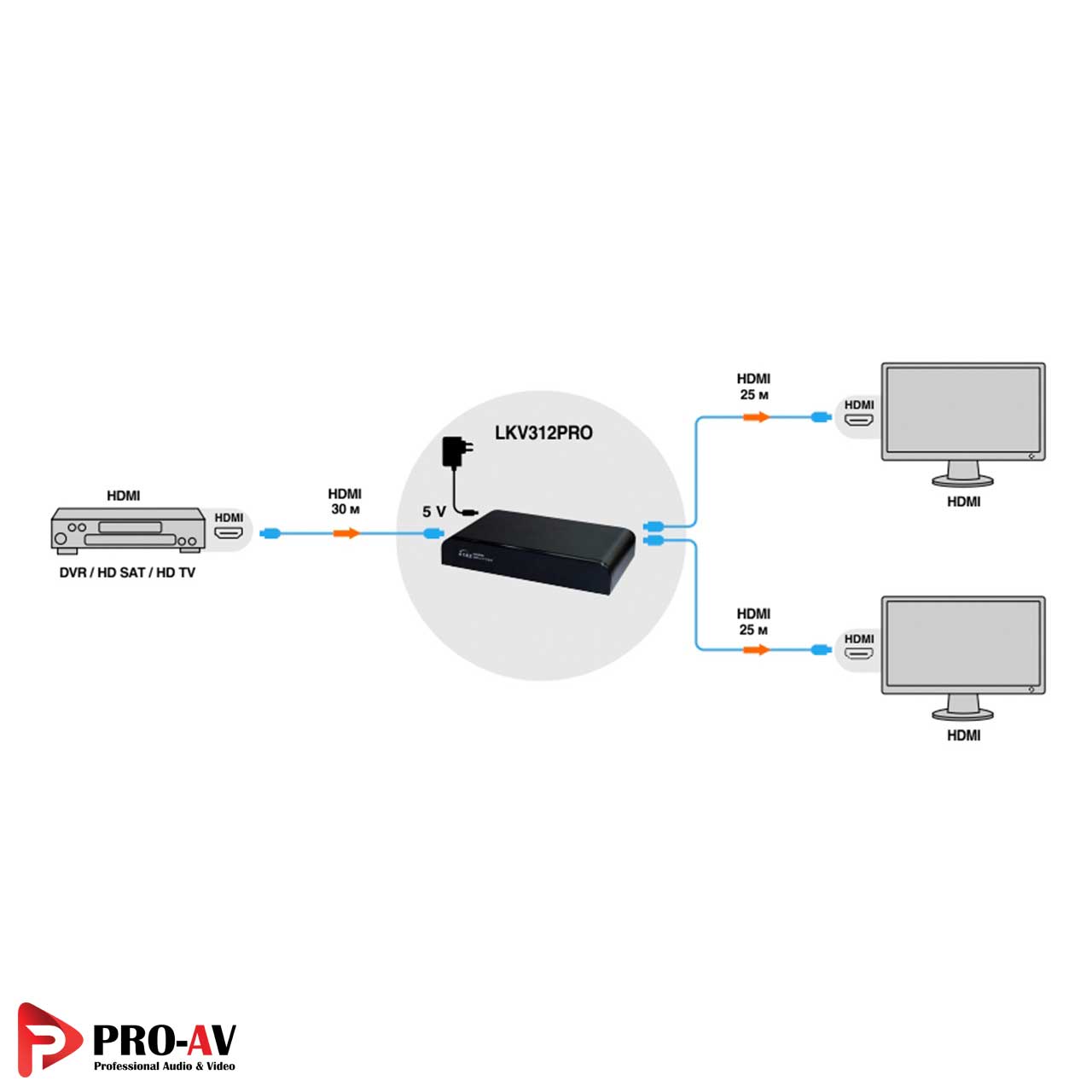 اسپلیتر HDMI مدل LKV312PRO، قابلیت دریافت سیگنال ویدئو منبع از روی کابل HDMI با طول بلند (تا 20 متر)، تقویت و ارسال سیگنال Full HD برای نمایش بر روی نمایشگر بسته به نوع سیگنال یا جنس کابل در فاصله دورتر (تا 20 متر) را دارد.