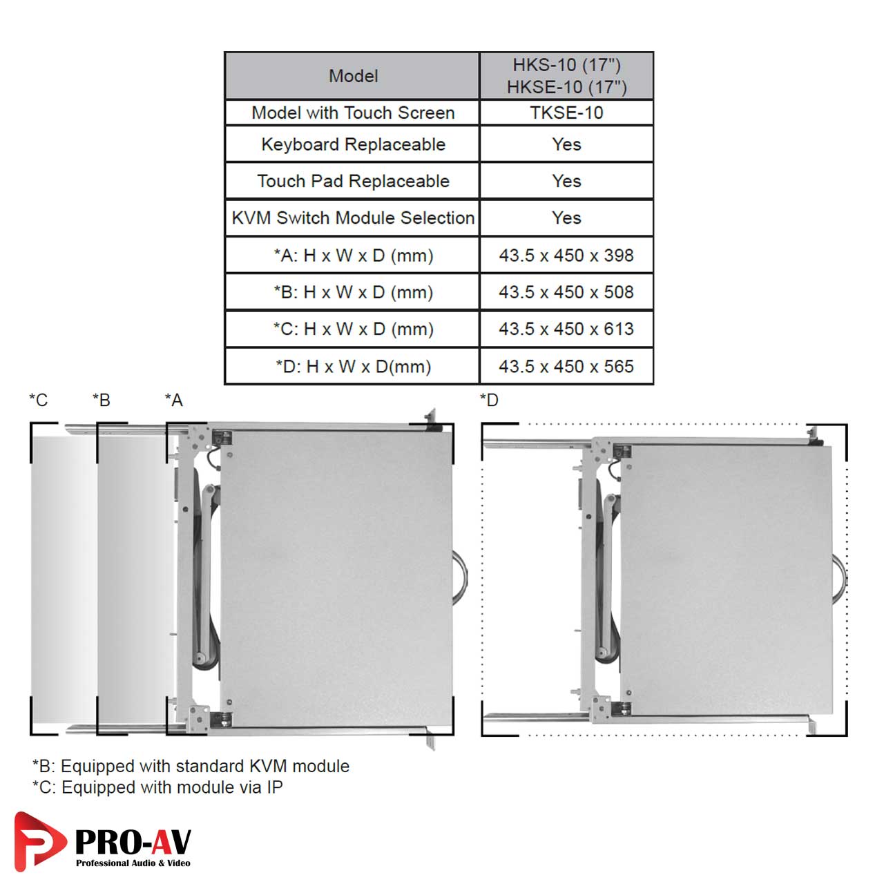 LCD کنسول 17 اینچ مدل HKSE-10 از خانواده کنسول های MKV از برند Rextron است LCD کنسول مدل HKSE-10 که شامل یک پنل با نمایشگر 17 اینچ به همراه کیبورد و موس بسیار مناسب برای مدیریت و کنترل آسان چندین رایانه و یا سرور های متصل از یک مکان توسط کاربر می باشد LCD کنسول مدل HKSE-10 با ابعاد استاندارد و مناسب برای نصب در کابین رک با عمق 20 اینچ (50 سانتیمتر) و یا بالاتر (با کیت براکت مناسب) طرحی شده است. LCD کنسول مدل HKSE-10 دارای پنل LCD بازشو با قابلیت پشتیبانی تا وضوح 1280x1024 و نور پس زمینه LED با مصرف پایین با زاویه دید 170 درجه است.