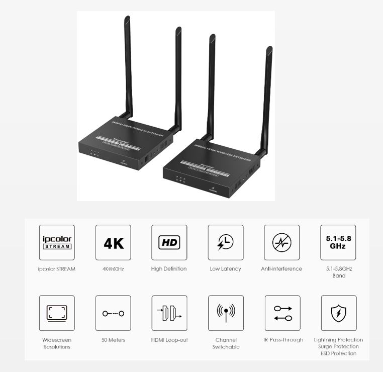این دستگاه یک اکستندر بیسیم HDMI با کیفیت 4k 60hz میباشد که شامل یک فرستنده و یک گیرنده است. فناوری ipcolor STREAM انتقال تصویر با کیفیت بالا HD و تأخیر کم را ممکن میسازد که بر پایهی باند فرکانس بی سیم 5G، عملکرد ضد تداخل و ایمنی را فراهم میکند. به این معنی هستش که حتی در یک اتاق هم میتوانید از چند اکستندر وایرلس HDMI لنکنگ استفاده کنید و نگران تداخل نباشید.