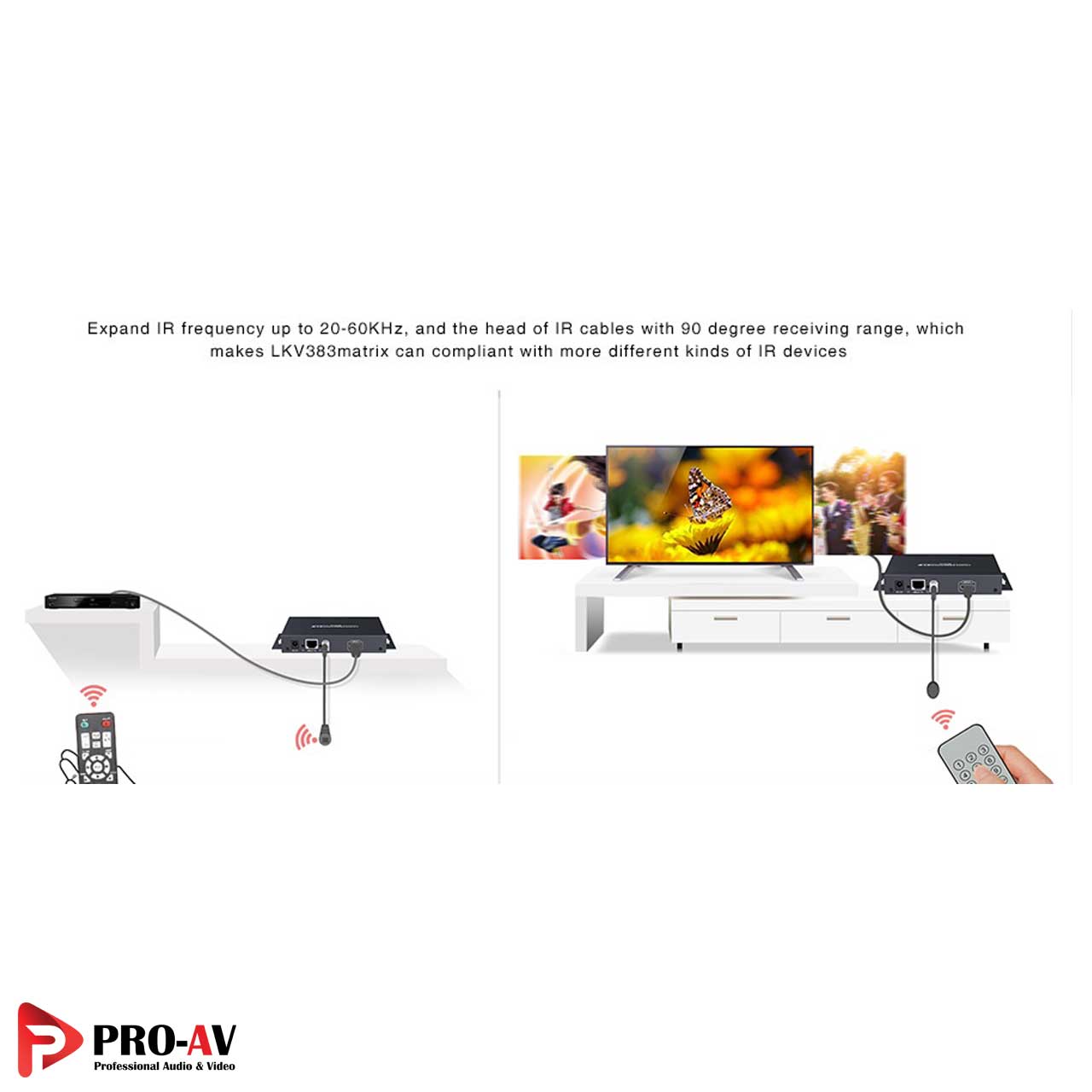 اکستندر HDMI مدل LKV383Matrix بااتصال کابل گیرنده امواج IR به گیرنده (RX) و اتصال فرستنده امواج IR به فرستنده (TX)، امواج IR از طریق کابل شبکه از گیرنده به فرستنده انتقال میدهد و کاربر بهراحتی وبالم دادن بر روی کاناپه و از طریق ریموت کنترل دستگاه منبع در فاصله دور را کنترل نماید.
