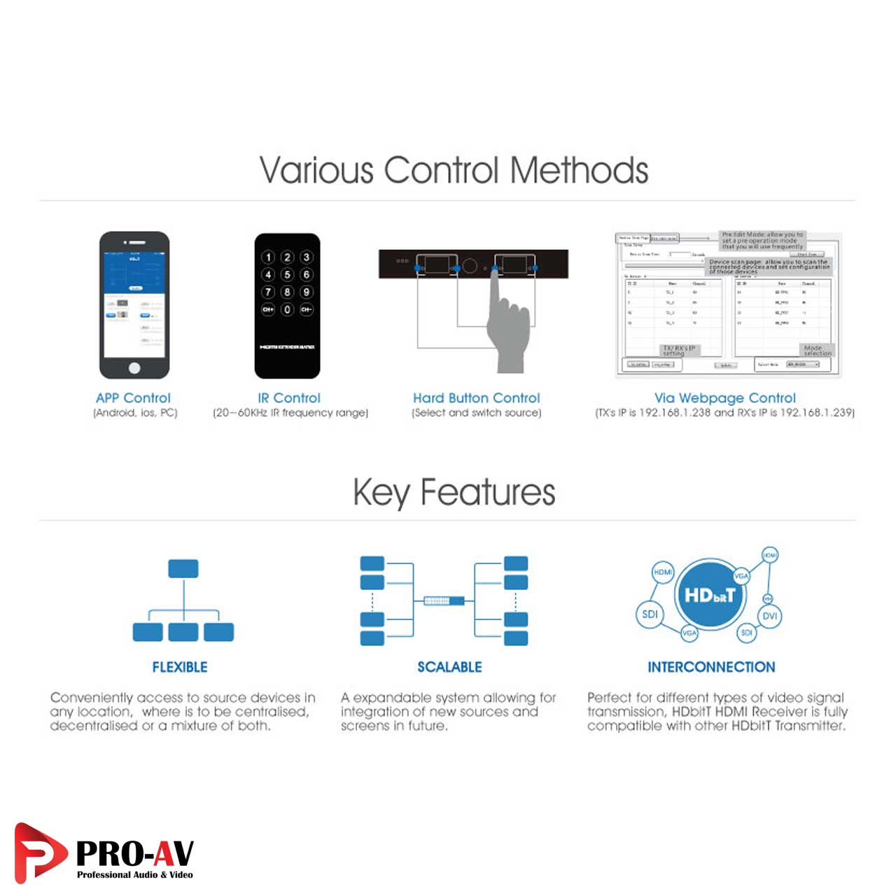 - انتقال تصویر تا 99 منبع به ۱ تا 254 نمایشگر با استفاده از سوئیچ یا روتر شبکه