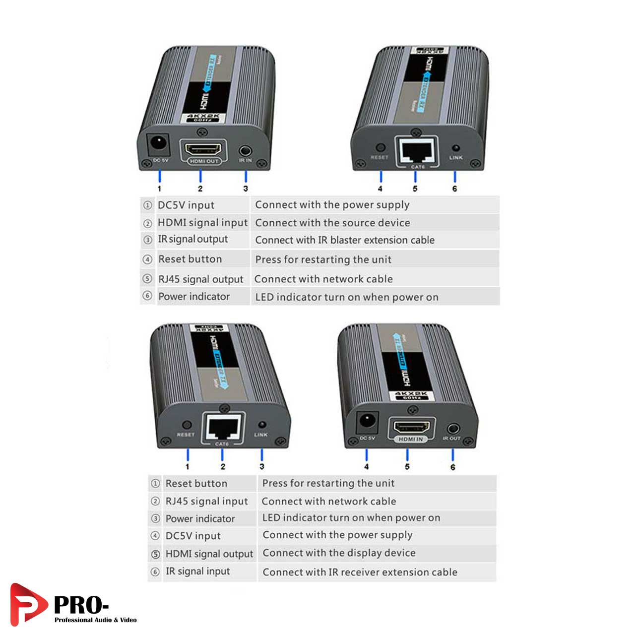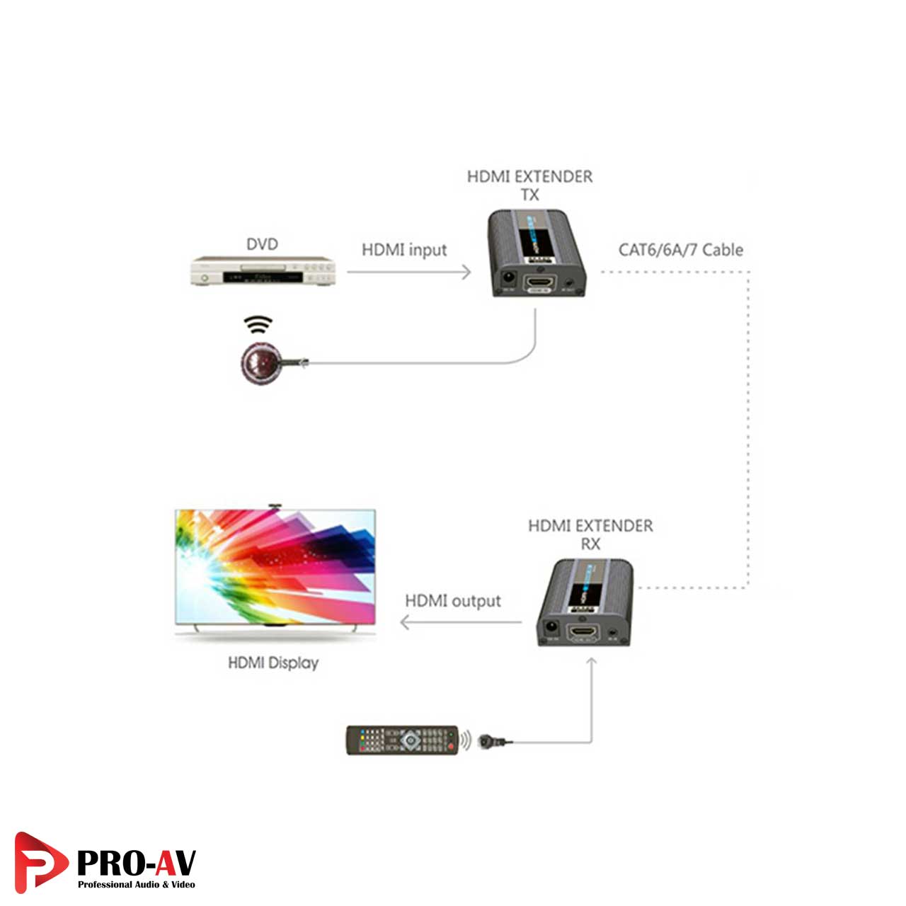 کاربر بااتصال کابل IR Out در مبدأ به فرستنده TX و قرار دادن آن روبروی دستگاه منبع و اتصال کابل IR IN به گیرنده RX در مقصد و قرار دادن آن روبروی خود و ریموت کنترل، کاربر بهراحتی در مقصد با ریموت کنترل دستگاه منبع را کنترل نماید.