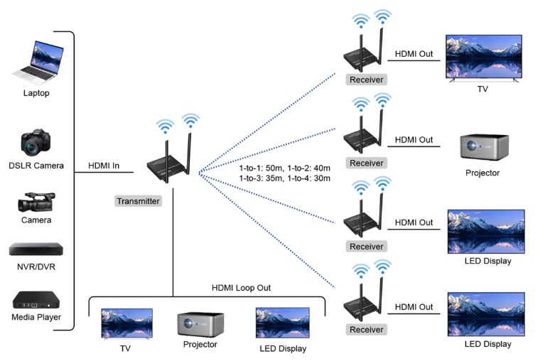 مدل LKV655-V2.0 برای پروژههایی مناسب است که نیاز به انتقال بیسیم تصویر HDMI به چند نمایشگر وجود دارد و کنترل منبع از راه دور اهمیت ندارد؛ مانند کافهها، فروشگاهها، تبلیغات دیجیتال و نمایش تصویر DVR/NVR.