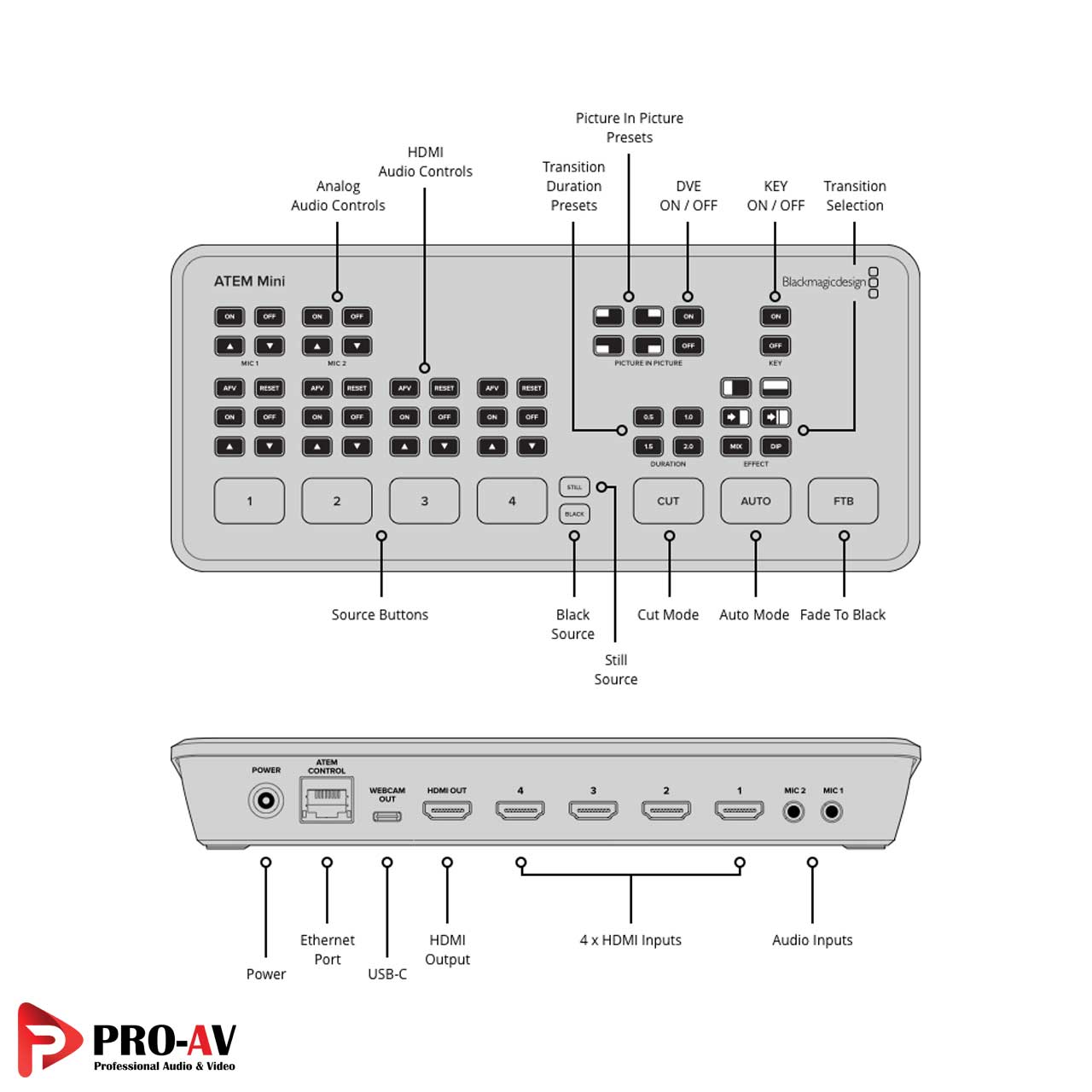 برای تمام ورودیهای صدا، دکمههای مجزا برای تنظیم میزان صدا بر روی پنل سوئیچر تصویر ATEM Mini تعبیه شده است.