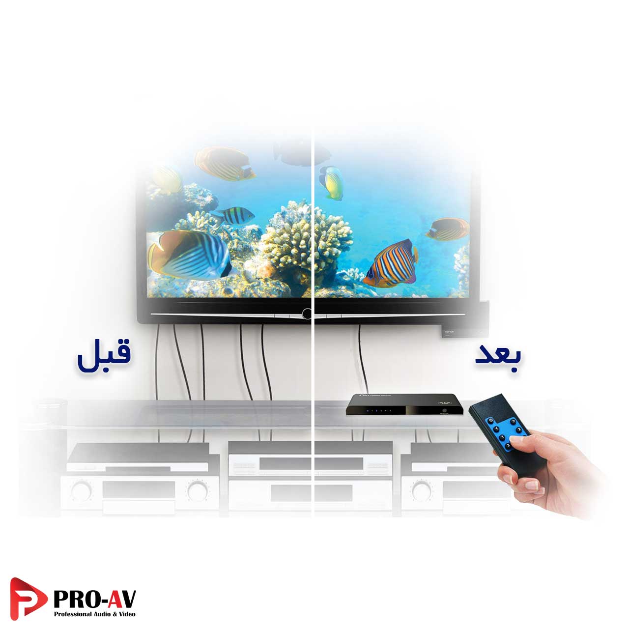 این سوئیچ HDMI ، با داشتن ۵ ورودی HDMI شمارا قادر به اتصال همزمان چندین دستگاه HDMI مانند HDTV، کنسول بازی، گیرنده دیجیتال، پخشکننده چندرسانهای و حتی رایانه شخصی و انتخاب از میان آنها و درنهایت نمایش بر روی نمایشگر از مشاهده تصویر باکیفیت لذت ببرید.