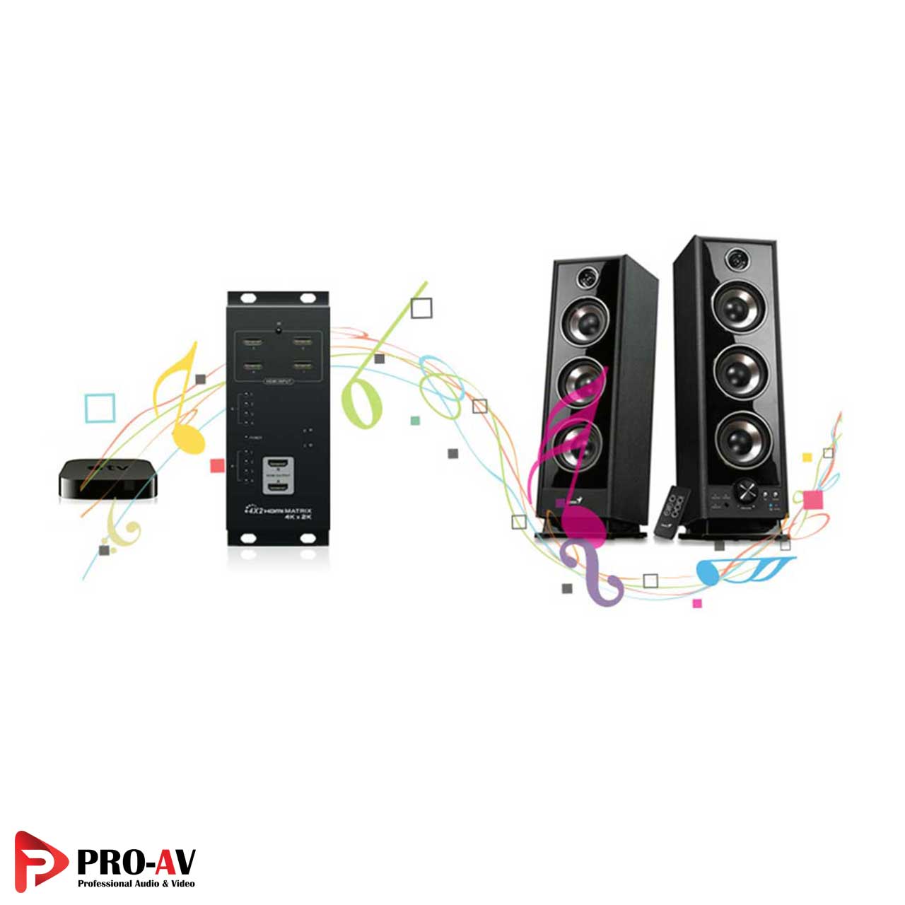 بیشتر تجهیزات صدا دارای وردی جکR/L و ورودی کواکسیال هستند. مدل LKV342Pro ، خروجی صدا و ۲ HDMI از هم جدا میکند، یک خروجی کواکسیال صدا و یک جکR/L صدای استریو بصورت هم زمان برای کار در محیط های مختلف را دارد.