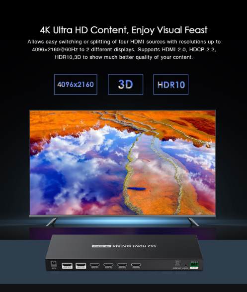 لنکنگ LKV422 یک ماتریکس سوئیچ 2×4 HDMI است. که می تواند 4 سیگنال ورودی HDMI را در صورت نیاز به 2 نمایشگر HDMI™ تغییر دهد. این سوئیچر لنکنگ تا رزولوشن 4096x2160@60Hz HDR را با چندین روش سوئیچینگ (کنترل از راه دور IR، دکمه ها، RS-232) برای تطبیق انعطاف پذیری دستگاه های ورودی و خروجی پشتیبانی می کند.