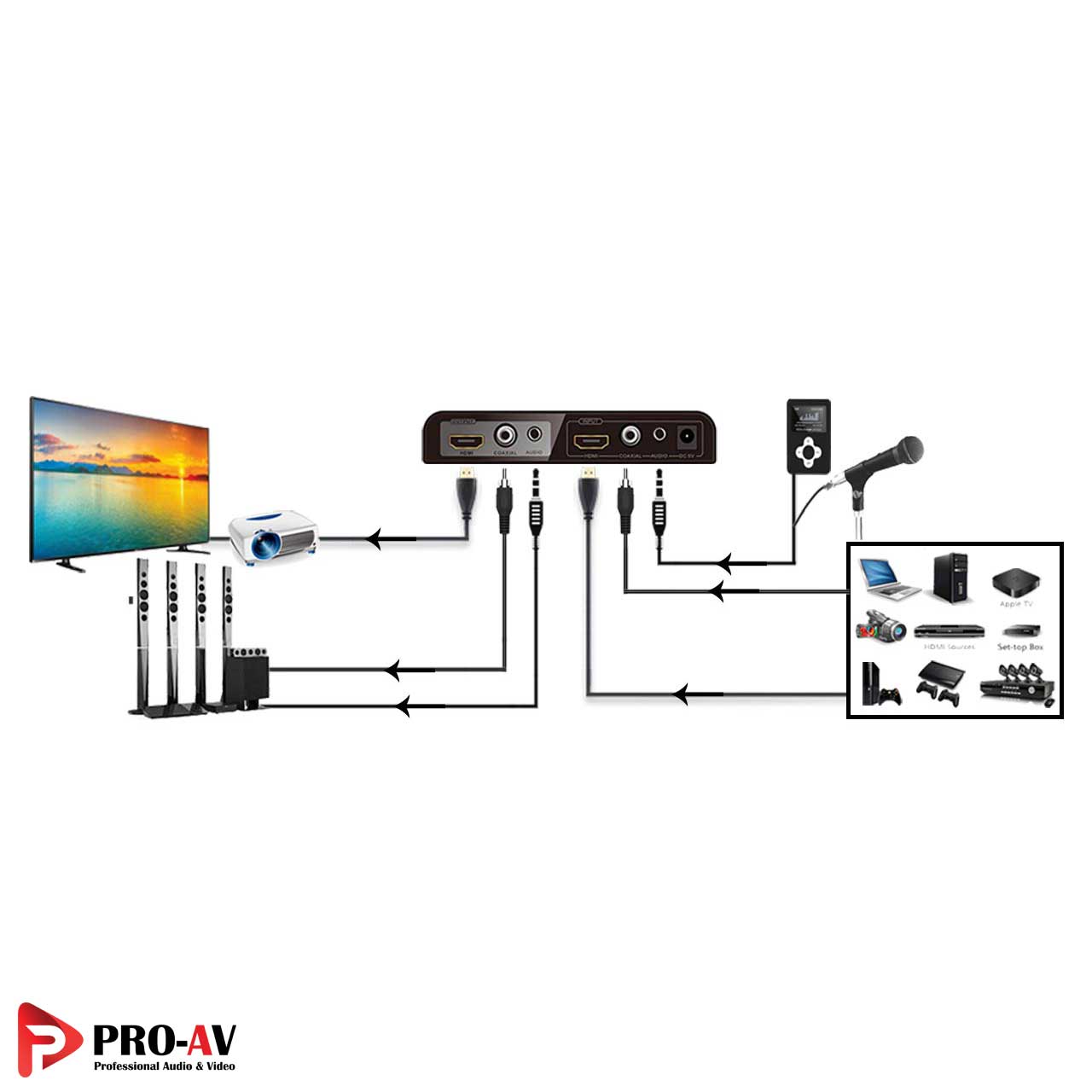 - قرار دادن صدای آنالوگ یا دیجیتال دلخواه در ورودی و درنهایت بر روی تصویر HDMI خروجی