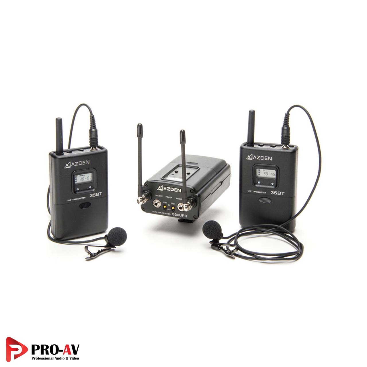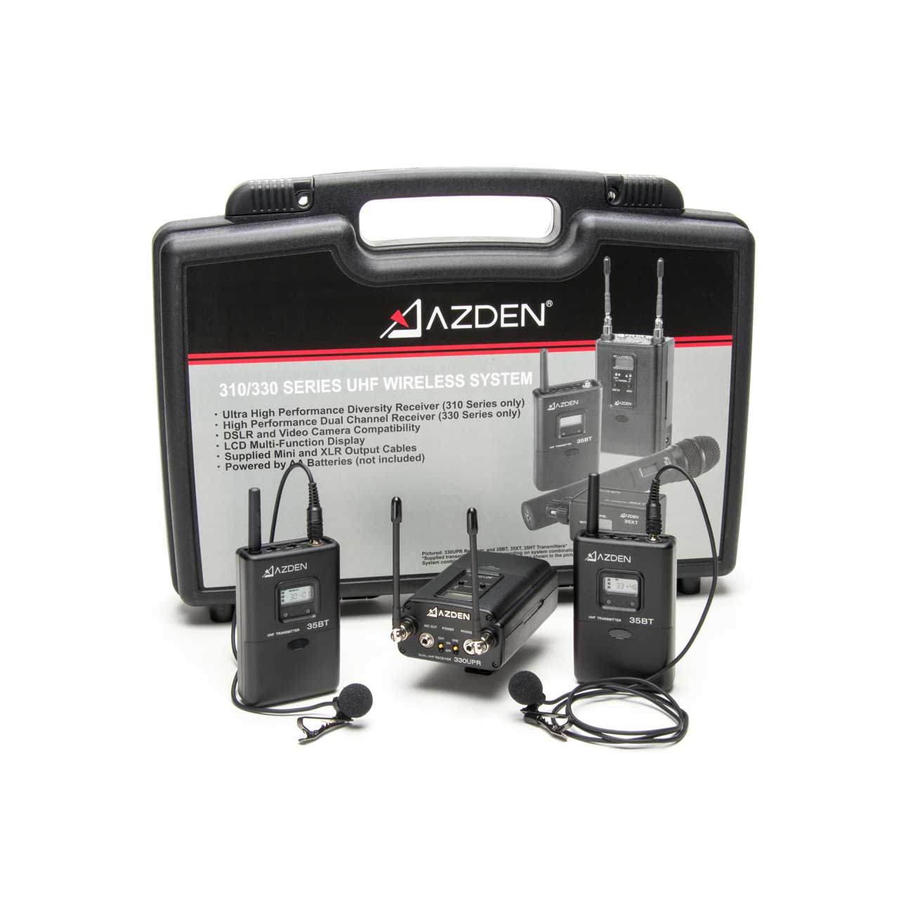 میکروفن بیسیم دو کانال AZDEN مدل 330LT یکی از سیستمهای قدرتمند و باکیفیت خانواده میکروفنهای حرفهای 300 کمپانی AZDEN است. این سیستم متشکل از یک گیرنده 330UPR، دو فرستنده Bodypack 35BT به همراه میکروفن یقهای EX-503 است. میکروفن 330LT با فعالیت بر روی باند UHF (امکان انتخاب ۱۸۸ فرکانس) و بهرهمندی از دو کانال مجزا بر روی فرستنده خود امکان استفاده از دو فرستنده را بهصورت همزمان به ارمغان میآورد.