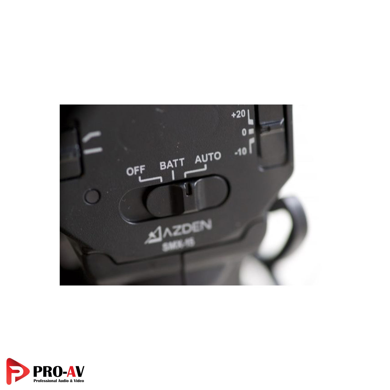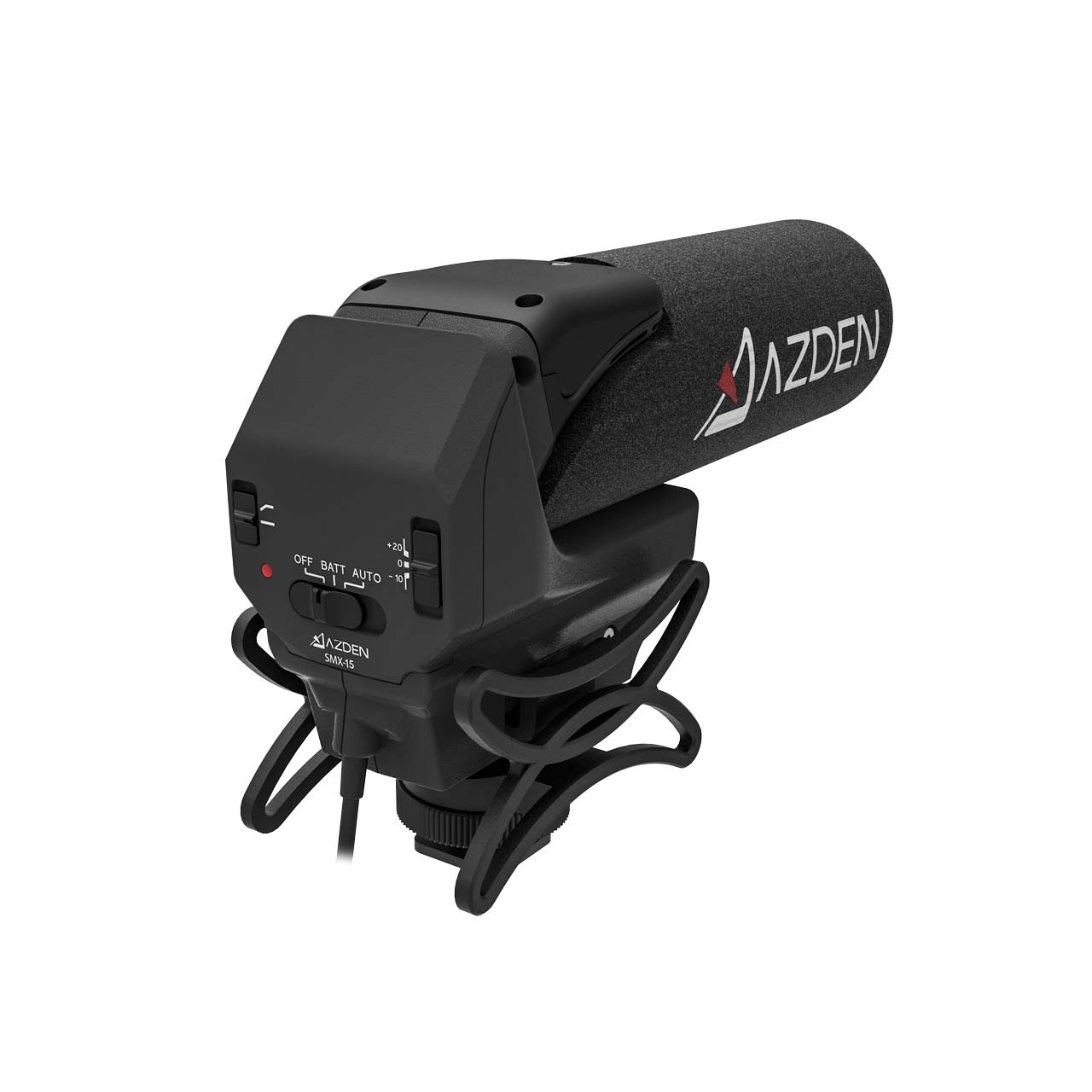 دوربینهای DSLR محدودیتهایی در تنظیم گین صدا دارند. همچنین پری امپ های استفادهشده در این دوربینها از کیفیت قابل قبولی برخوردار نیستند و در صورت بالا بردن گین ، نویز مشهودی را شاهد خواهیم بود. کمپانی AZDEN با قرار دادن پد کنترلی گین بر روی میکروفن SMX-15 این مشکل را مرتفع نموده است. این سوییچ سه حالتِ امکان انتخاب حالات +۲۰dB (با توجه به وجود پیش تقویتکننده سیگنال) جهت افزایش سطح دینامیکی میکروفن و -۱۰dB جهت جلوگیری از دیستورشن برای مواقعی که در حال ضبط صدا در فضاهایی با حجم صدایی بالا ، مانند کنسرت و ... را هستید، داراست.