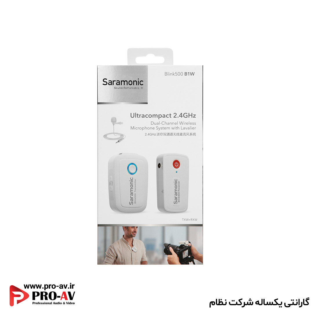 میکروفون بی سیم سارامونیک Blink500 B1W از سری میکروفونهای بیسیم Blink500 این کمپانی است. کمپانی سارامونیک در طراحی و ساخت این سری از میکروفونهای بیسیم خود از جدیدترین و به روزترین تکنولوژیها در تولید میکروفون بیسیم کمک گرفته است تا بتواند کالایی را در کوچکترین و سبکترین حالت ممکن و با ویژگیهای خاص ارائه نماید ، که بتواند پاسخگوی نیازهای تمام طیف کاربران از مبتدی تا حرفهای باشد و در شرایط گوناگون کاربری مورد استفاده باشد. این خانواده از میکروفون بیسیم که در باند فرکانسی 2.4 گیگاهرتز و با برد مناسب 50 متری فعالیت می کنند ، از یک فرستنده و سه نوع گیرنده با درگاه های 3.5 میلیمتری ، لایتنینگ و USB Type-C تشکیل شده است که با قرارگیری فرستنده با گیرندههای متفاوت ، پکیج های B1 تا B6 را می سازند.