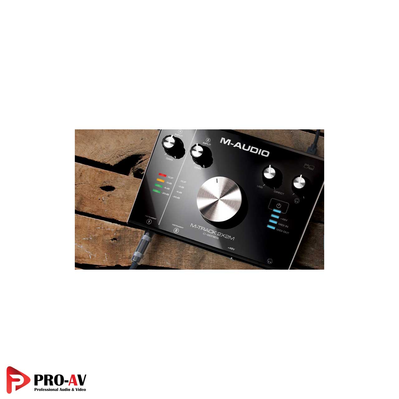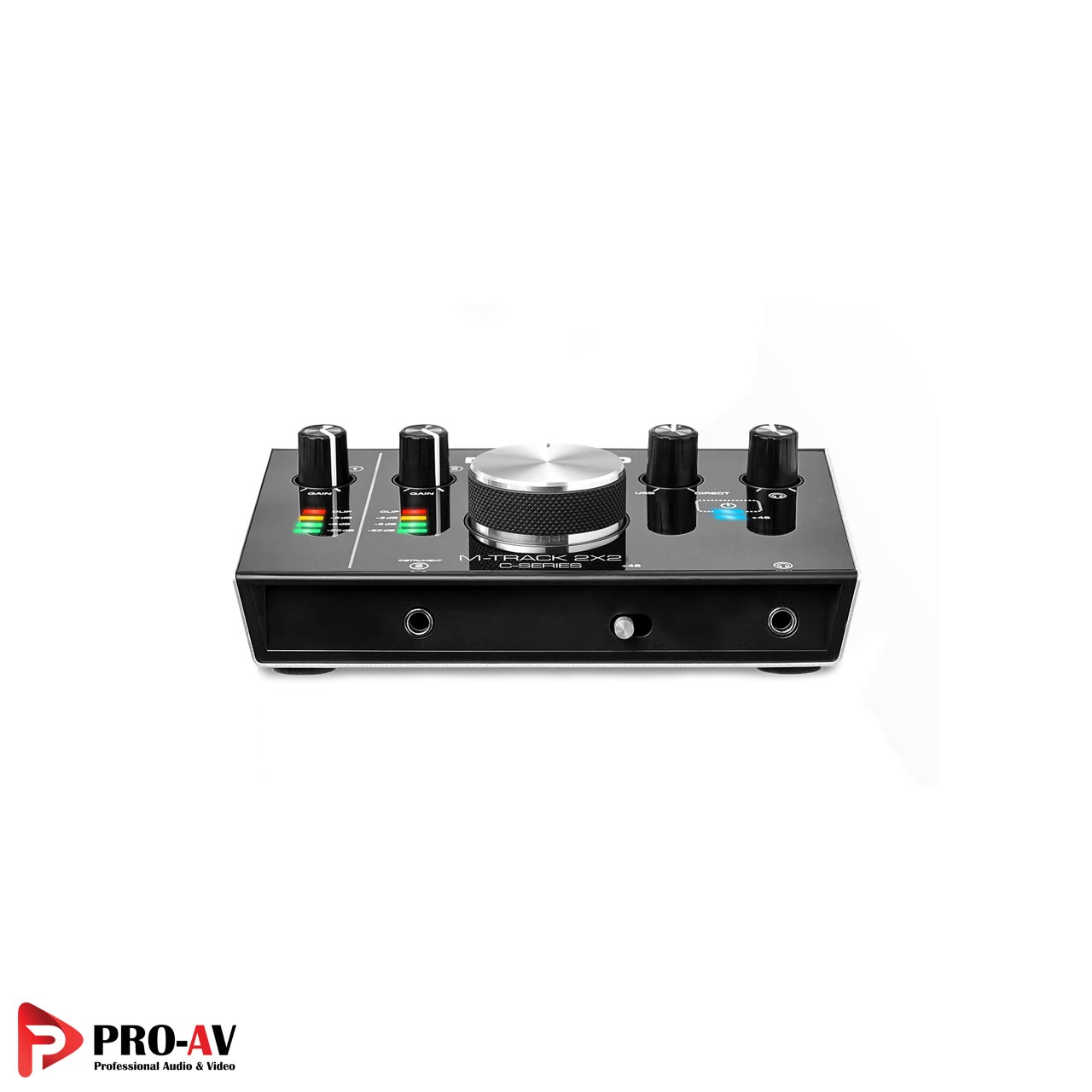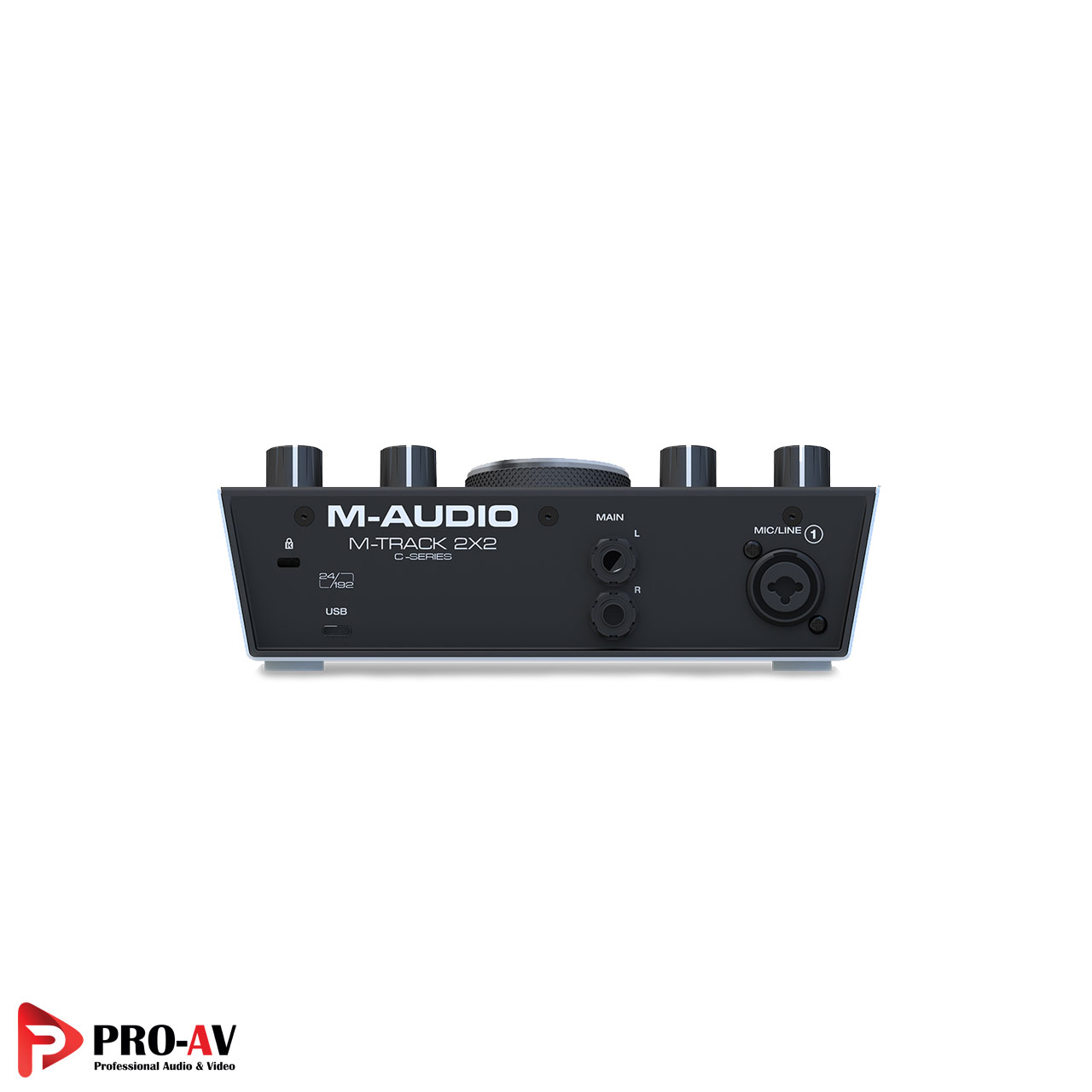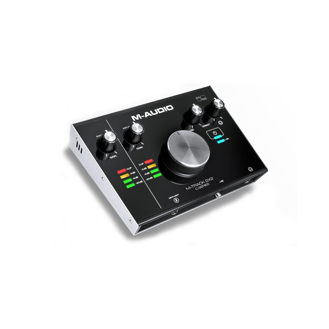 کارت صدای M-Track 2X2 دارای یک ورودی میکروفن مجهز به منبع تغذیه فانتوم +48 در پشت دستگاه است. در جلوی دستگاه به جهت اتصال انواع سازها یپکاپ دار مانند گیتار های بیس و الکتریک یک ورودی اینسترومنت (Hi-Z) با نویز پایین و کیفیت بالا با تکنولوژی Tailor-Made تعبیه شده است که به علت تاخیر بسیار ناچیز آن می تواند بر روی صحنه نیز به کار برده شود. هر یک از ورودی های دستگاه دارای یک ولوم تنظیم گین هستند. همچنین به جهت مانتور کردن لحظه ای و نظارت بر روی ورودی ها یک خروجی هدفون با جک 1/4 اینچی در جلوی دستگاه تعبیه شده است.