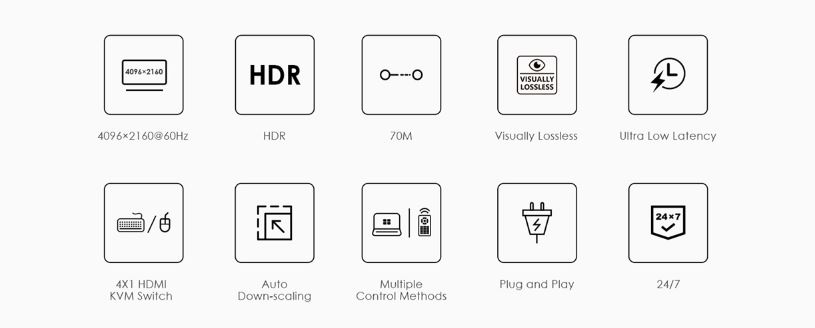 این دستگاه یک سوئیچ توسعه دهنده KVM با کیفیت فوق العاده بالا 4 در 1 است که از 4 ورودی سیگنال HDMI™ و 1 سیگنال خروجی HDMI™ پشتیبانی می کند. سیگنال تا کیفیت HDMI™ 4K@60Hz را می توان از طریق کابل شبکه CAT6 یا بالاتر تا 70 متر برد افزایش دهید. بالاترین وضوح 4K@60Hz سازگار است و همینطور از کنترل KVM پشتیبانی می کند. این محصول به طور گسترده در نظارت بر امنیت، آموزش و پرورش، نمایشگاه ها و پخش، مراکز فرماندهی و غیره استفاده می شود.