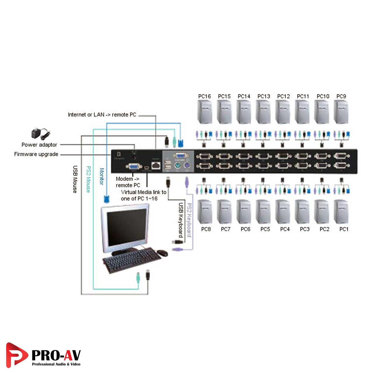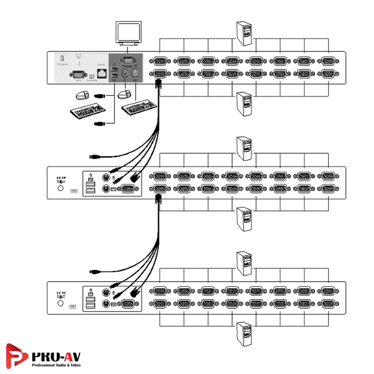 - کنترل کردن تا 3 سطح؛ تا 8/64/512 (فقط برای سوئیچ 8 پورت) و 16/256/4096 کامپیوتر (فقط برای 16 پورت) از یک کنسول واحد
